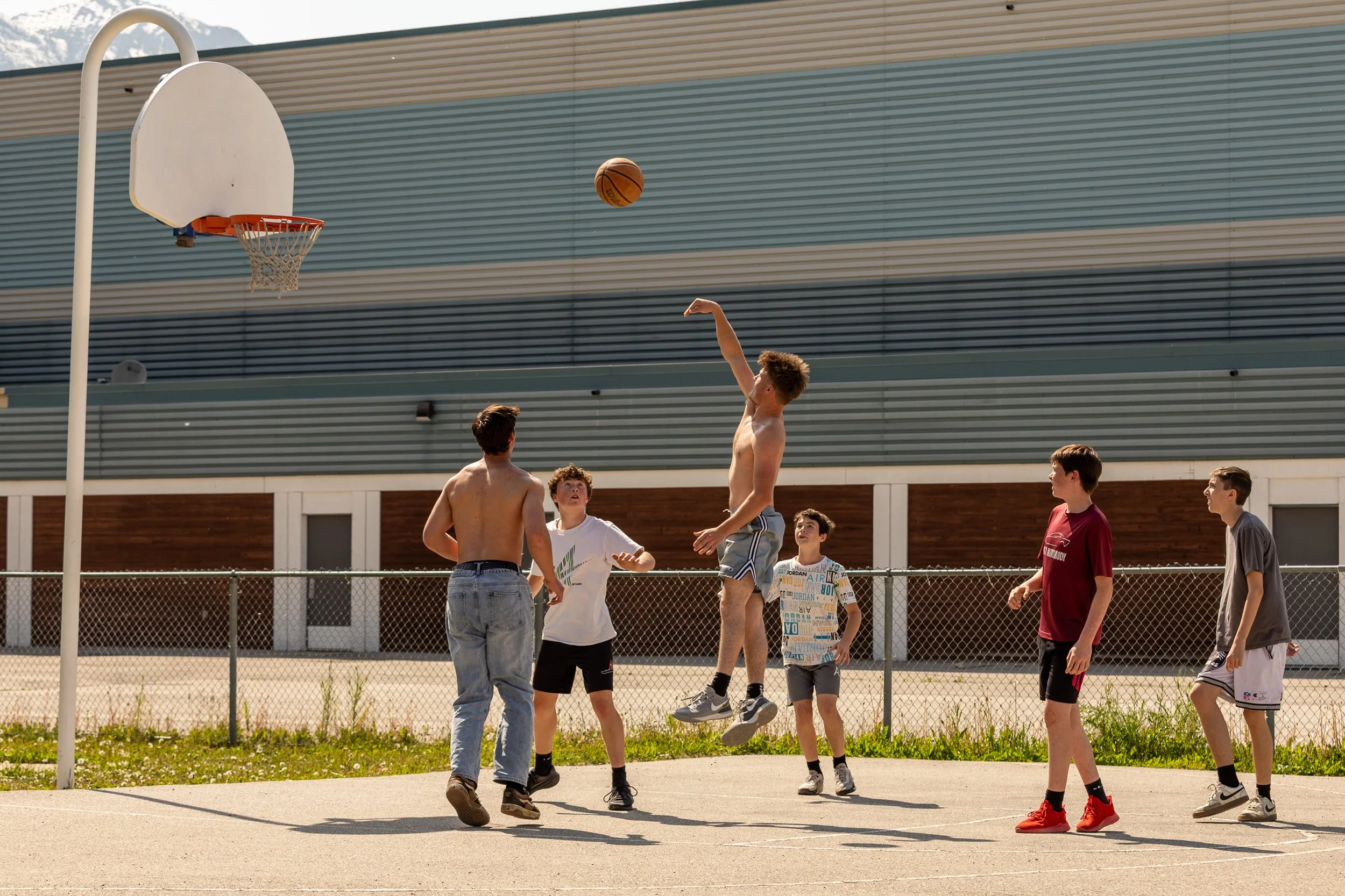 Members of the Golden Secondary School boysβ basketball team practicing their shots on the outdoor court.